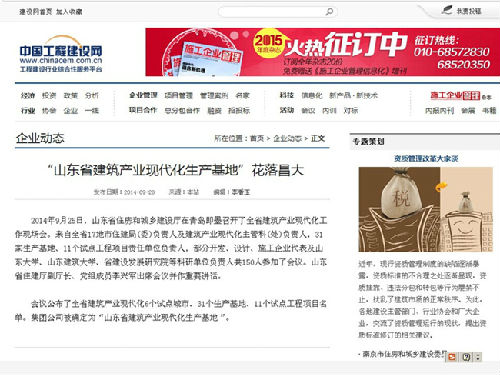“山东省建筑产业现代化生产基地”花落太阳成集团tyc234cc——中国工程建设网“企业动态”2014.9.28