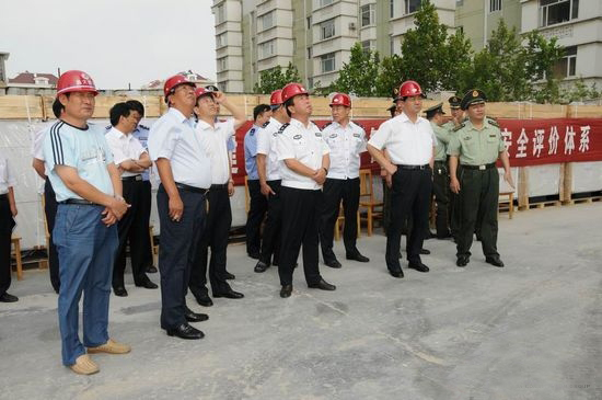 7月30日下午,市委副书记、市长许立全在市政府顾问、公安局长黄潍连和市特警支队有关领导的陪同下,在集团公司承建的阳光大厦工地观摩了高空消防演练。此次消防演练主要是针对我市的高层建筑逐渐增多的情况,解决高层建筑消防问题,我市耗资380多万元新购进高空消防车,首次亮相参加演练。 集团公司副总经理、总工程师张连悦陪同观摩。