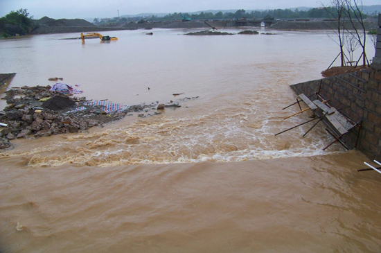 7月24日至25日,一场特大暴雨突袭北川新县城,集团公司援建的多处工地受到影响。至25日凌晨,职工宿舍、办公室、食堂等地方进水高达40cm,集团公司的援川人员,特别是第八分公司的员工及时展开自救。几个小时内,大家先后将室内的物品转移到高处没有进水的房间,天一亮,指挥部便紧急组织工地抢险,大家分工协同,分别赶赴安昌河下游施工段和安昌河已验收河段查看受灾情况……由于指挥部早在20日就下达安昌河防防汛通知,各施工单位提前应对,从而保证在这次特大洪水来临时,所有施工人员安全撤离、所有材料转移(由于汛情超过预想,第八分公司安昌河下游施工段景观湿地形成了大面积积水致使一些土方机械过水)。此次洪水来袭,已竣工的安昌河段安然无恙,第八分公司正在施工的安昌河下游溢流堰、挡水堰已经合拢,经受住了洪水冲击。 ![]() 洪水中的施工现场