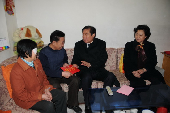 1月19日上午,潍坊市政协主席赵兴涛,市政协副主席、市总工会主席满国强等在集团公司董事长徐鹏强陪同下,分别走访慰问了集团公司全国劳模刘洪章和两个困难户家庭——第二分公司任文君和物业分公司赵淑贞。陪同走访的还有市建设局党委副书记高峰,集团公司高管层领导滕忠斌、李坤明等。 ![]() 徐董事长陪同赵兴涛走访 ![]() 走访赵淑贞 ![]() 走访任文君 ![]() 走访慰问全国劳模刘洪章 ![]() 与刘洪章合影留念