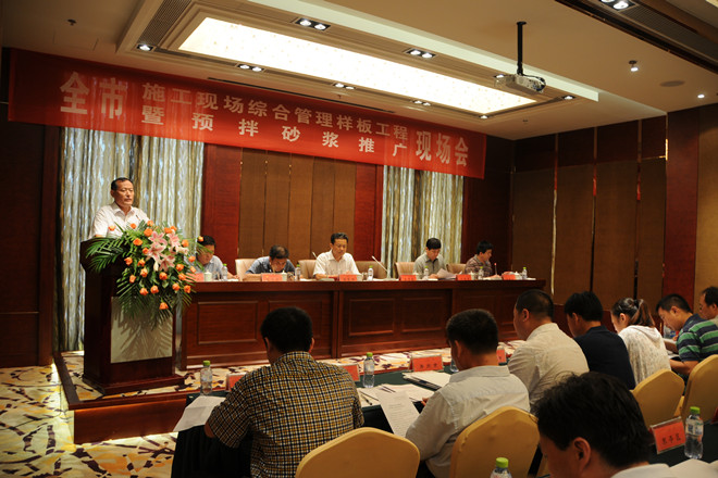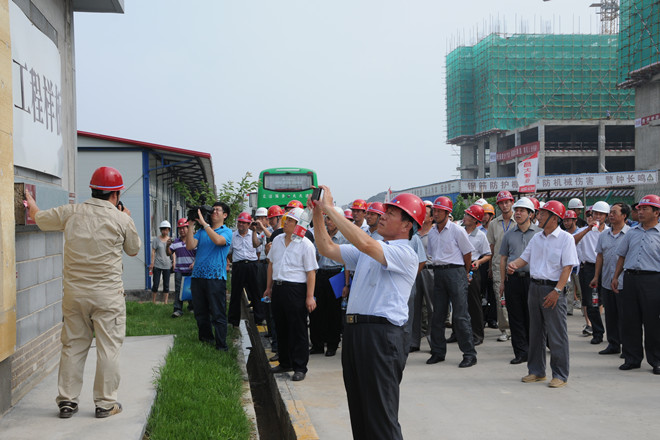 7月25日上午,由潍坊市建筑工程管理处组织的“全市施工现场综合管理样板工程暨预搅拌砂浆推广现场会”在集团公司第四分公司承建的金融广场举行。来自潍坊各县市区、市属开发区建工处(局)分管主任(局长)、有关科室负责人;全市房屋建筑施工总承包一级企业和部分二级企业分管经理,部分预搅拌砂浆生产企业代表共计120余人参加了现场会。集团公司总工程师张连悦出席现场会并做专题经验介绍,集团公司质量技术部、生产安全部、资产管理部等有关部门相关人员参加了上午的现场会。