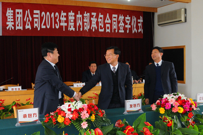 2013年4月20日下午,集团公司2013年度内部经营承包合同签字仪式在集团总部第一会议室举行。集团公司高管层领导徐鹏强、朱九洲、滕忠斌、李坤明、姜建鲁、穆乃杰、张连悦、张学智、闫鹏、刘雁冰,17个签约单位领导班子成员、总部部室负责人共80人参加了承包合同签字仪式。