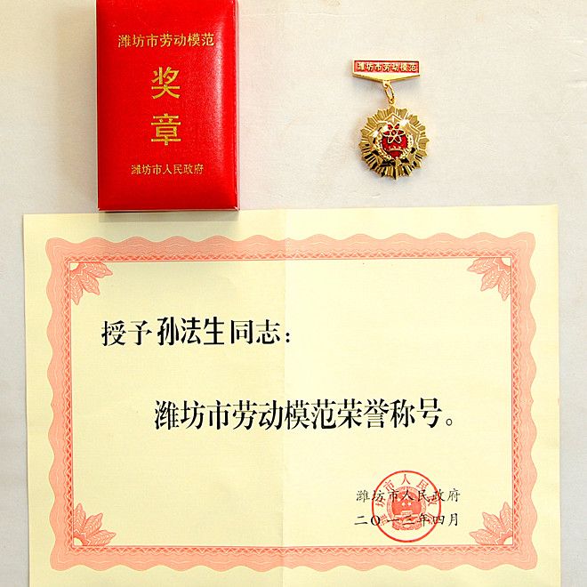 2013年4月27日上午,潍坊市委、市政府在市工人文化宫隆重召开潍坊市庆祝“五•一”国际劳动节暨劳动模范命名表彰大会,授予全市各行各业182名同志“潍坊市劳动模范”荣誉称号,77名同志“潍坊市先进工作者”荣誉称号。集团公司机械化施工分公司安拆班长孙法生荣获“潍坊市劳动模范”荣誉称号。