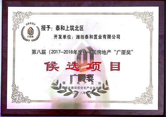 | 集团再获“广厦奖”候选项目 2018年6月21日,集团潍坊泰和置业有限公司历经十多年精心打造的泰和上筑北区经典项目,获得第八届(2017-2018年度)中国房地产“广厦奖”候选项目荣誉。 “广厦奖”是经国务院住房和城乡建设部批准,由中国房地产业协会、住房和城乡建设部住宅产业化促进中心共同设立的房地产综合性大奖,是我国行业内最具权威的国家级房地产奖项,与“鲁班奖”一样,代表房地产行业的最高荣誉。“广厦奖”于2006年首次设立,每两年一次,今年是第八届。 “广厦奖”获奖项目必须以建设资源节约型、环境友好型的社会主义和谐社会和生态文明为宗旨,其规划设计水平高、环境质量好、工程质量优,在推进住宅产业化、“四节一环保”和解决广大群众住房问题方面能起示范带动作用。 “广厦奖”的评选,遵循“公开、公平、公正、公益”的原则,自下而上进行,需通过市、省、国家三级评选机构层层选拔和严格把关,评奖程序严格,全程阳光操作,并接受社会监督;百姓满意度是评审的重要指标之一,实行一票否决。最终获奖项目都在业界及购房者中具有很大影响和极高品质。 在泰和上筑北区项目还未正式入市时,就受到潍坊市民的广泛关注和热烈追捧。这也是对太阳成集团tyc234cc太阳成集团tyc234cc地产的信任和认可,泰国和公司将本着对城市、历史和业主负责的态度,开发建设并运营好这个精品项目。