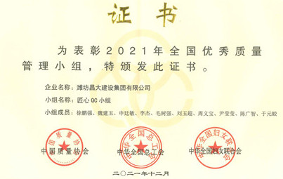 由集团机施公司匠心QC小组编写的成果《施工升降机新型电缆臂架的研制》,经初赛、复赛和决赛,在荣获特等奖后被推荐至中国质量协会代表建筑行业作进一步的竞赛交流,该匠心QC小组也被中国质量协会、中华全国总工会、中华全国妇女联合会评选为2021年全国优秀质量管理小组,代表了建筑行业质量管理小组活动的最高水平。