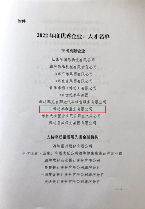新元肇启,万事可期。2023年1月29日,奎文区高质量发展动员大会在区机关综合服务中心召开。区委书记周俊出席会议并讲话,区长刘建安主持会议,区委副书记李庆华宣读表扬通报,集团所属潍坊泰和置业有限公司被评为奎文区“2022年度突出贡献企业”。每一项荣誉的背后,既是奎文区委、区政府和各级单位对集团以及泰和置业公司的支持与认可,也是太阳成集团tyc234cc地产人对初心的坚守与践行。春回大地万象新,砥砺奋进正当时。2023年,泰和置业将以此为鞭策和鼓舞,勠力同心、再接再厉,以不懈奋斗者的姿态、以永作追梦人的果敢,发奋“兔”强,“兔”飞猛进!