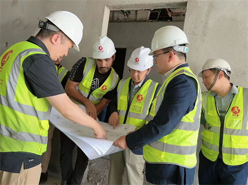 在多哈公司正在施工的水岸公寓6#楼及Simex物流园项目施工现场,徐鹏强董事长看望慰问项目施工人员,详细了解工程施工进度、存在问题和员工生活等情况,并同现场一线人员座谈交流。