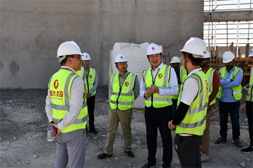 在多哈公司正在施工的水岸公寓6#楼及Simex物流园项目施工现场,徐鹏强董事长看望慰问项目施工人员,详细了解工程施工进度、存在问题和员工生活等情况,并同现场一线人员座谈交流。