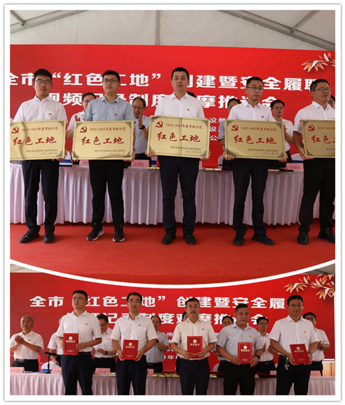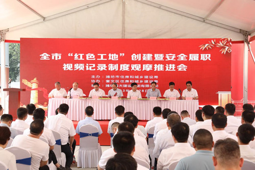2023年6月28日上午,全市“红色工地”创建暨安全履职视频记录制度观摩会在集团四建公司总承包施工的潍坊市人民医院内科院区项目现场举办。山东省建设工程质量安全中心主任王华杰,潍坊市住建局党组书记、局长马冰,潍坊市委组织部组织二科科长李连伟,潍坊市直机关工委组织部四级调研员李桂波,潍坊市住建局党组成员、建筑业发展服务中心党委书记、主任许增贤,潍坊市奎文区委常委、组织部长田学刚,潍坊市建筑业发展服务中心专职副书记、纪委书记彭玉刚,潍坊市奎文区住建局党组书记、局长张文干等在主席台就座;各县市区、市属有关开发区住建局代表、“红色工地”创建工作先进单位、优秀班组、先进个人及优秀示范项目代表共100余人参加会议。集团公司纪委书记穆乃杰受党委书记、董事长徐鹏强委托出席会议致欢迎辞并作了题为《党建引领方向、红色铸就经典》的典型交流发言。