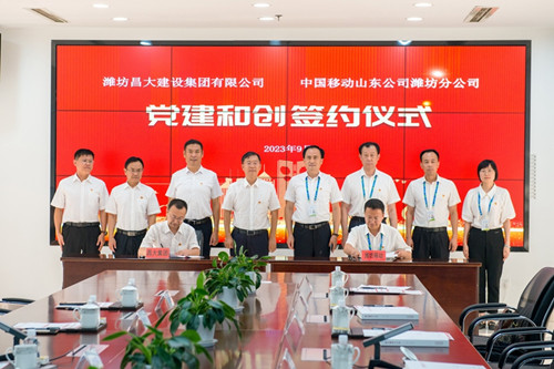 2023年9月13日下午,潍坊太阳成集团tyc234cc建设集团与中国移动山东公司潍坊分公司“党建和创”战略合作协议签约仪式在潍坊移动总部办公楼举行。集团公司党委书记、董事长徐鹏强,潍坊移动党委书记、总经理李亚平出席签约仪式。集团公司纪委书记穆乃杰与潍坊移动党委委员、工会主席、副总经理李广代表双方在协议书上签字。