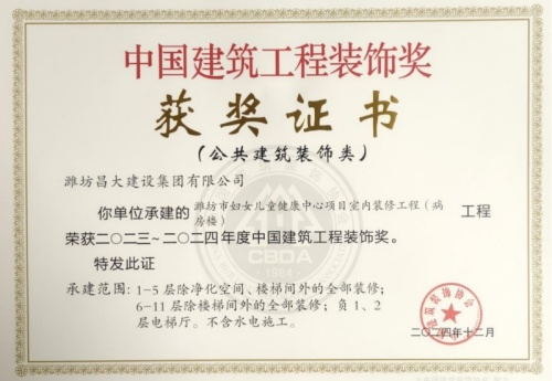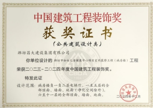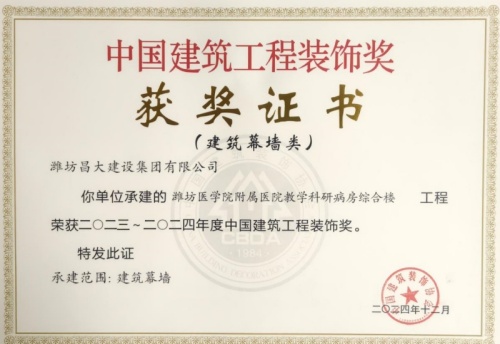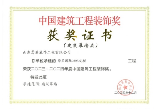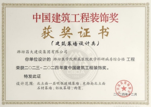 2024年12月10日,中国建筑装饰协会在北京召开大会,表彰2023~2024年度“中国建筑工程装饰奖”工程。集团装饰幕墙工程公司、山东鸢港装饰工程有限公司的三项工程荣获五个奖项:潍坊医学院附属医院教学科研病房综合楼(建筑幕墙类和幕墙设计类)、潍坊市妇女儿童健康中心病房楼(公共建筑装饰类和公共建筑装饰设计类),柒星国际2#住宅楼(建筑幕墙类)。